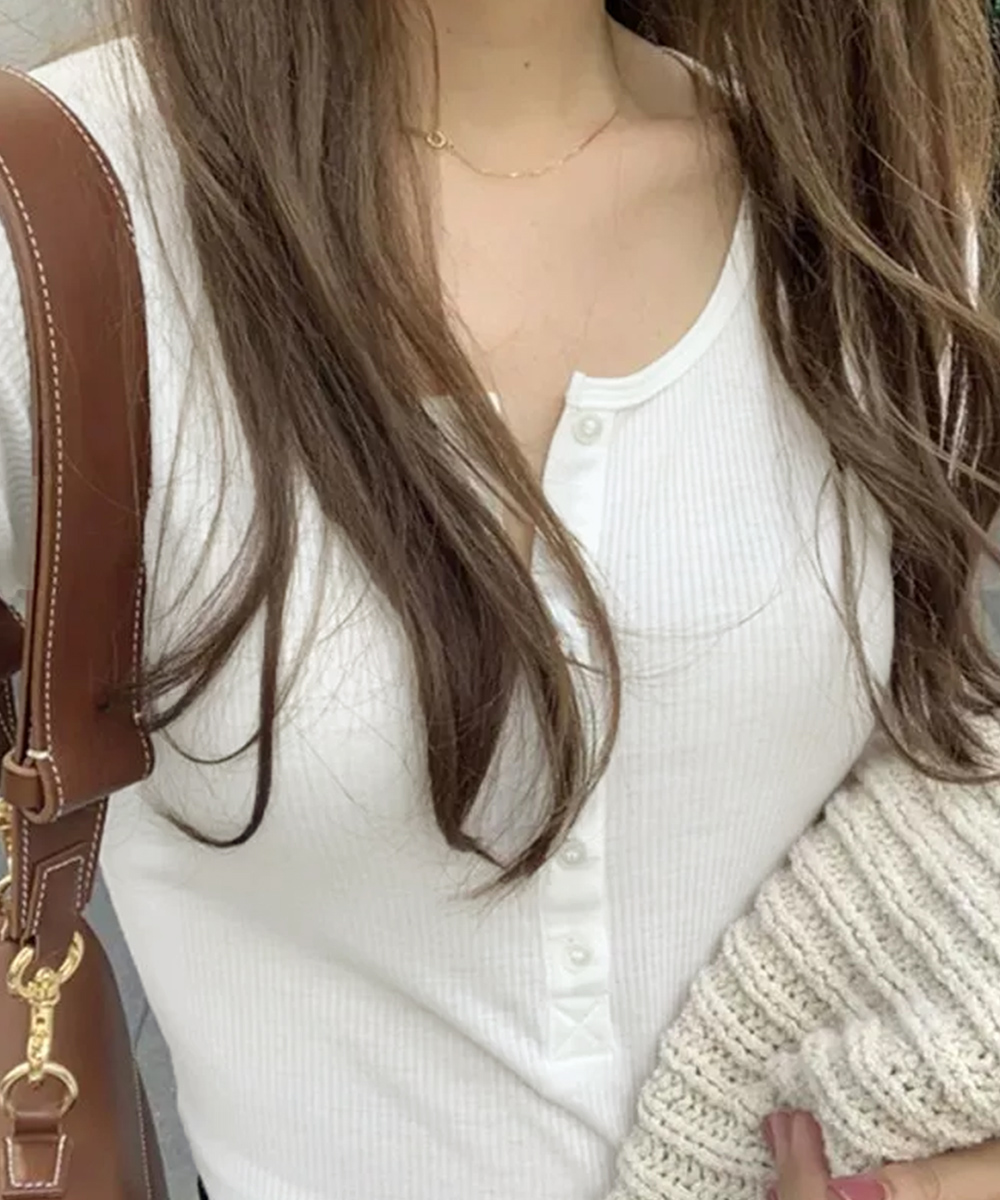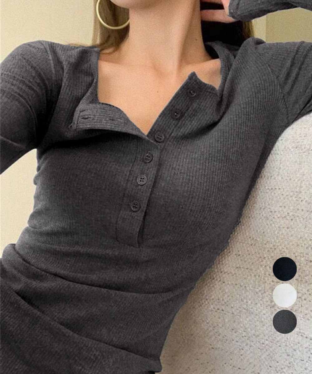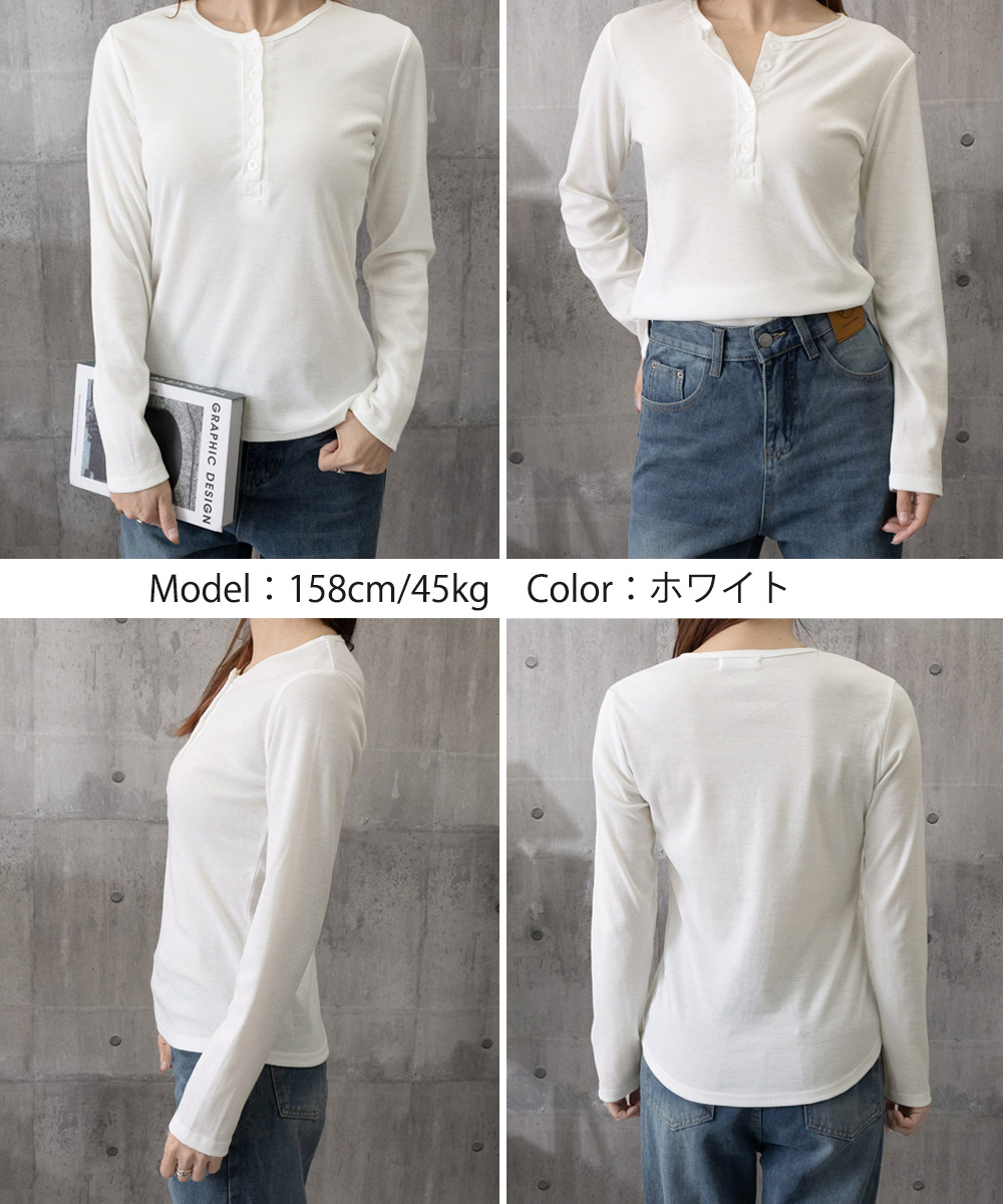 シンプルファッションに最適なリブ編み長袖ヘンリーネックカットソー。