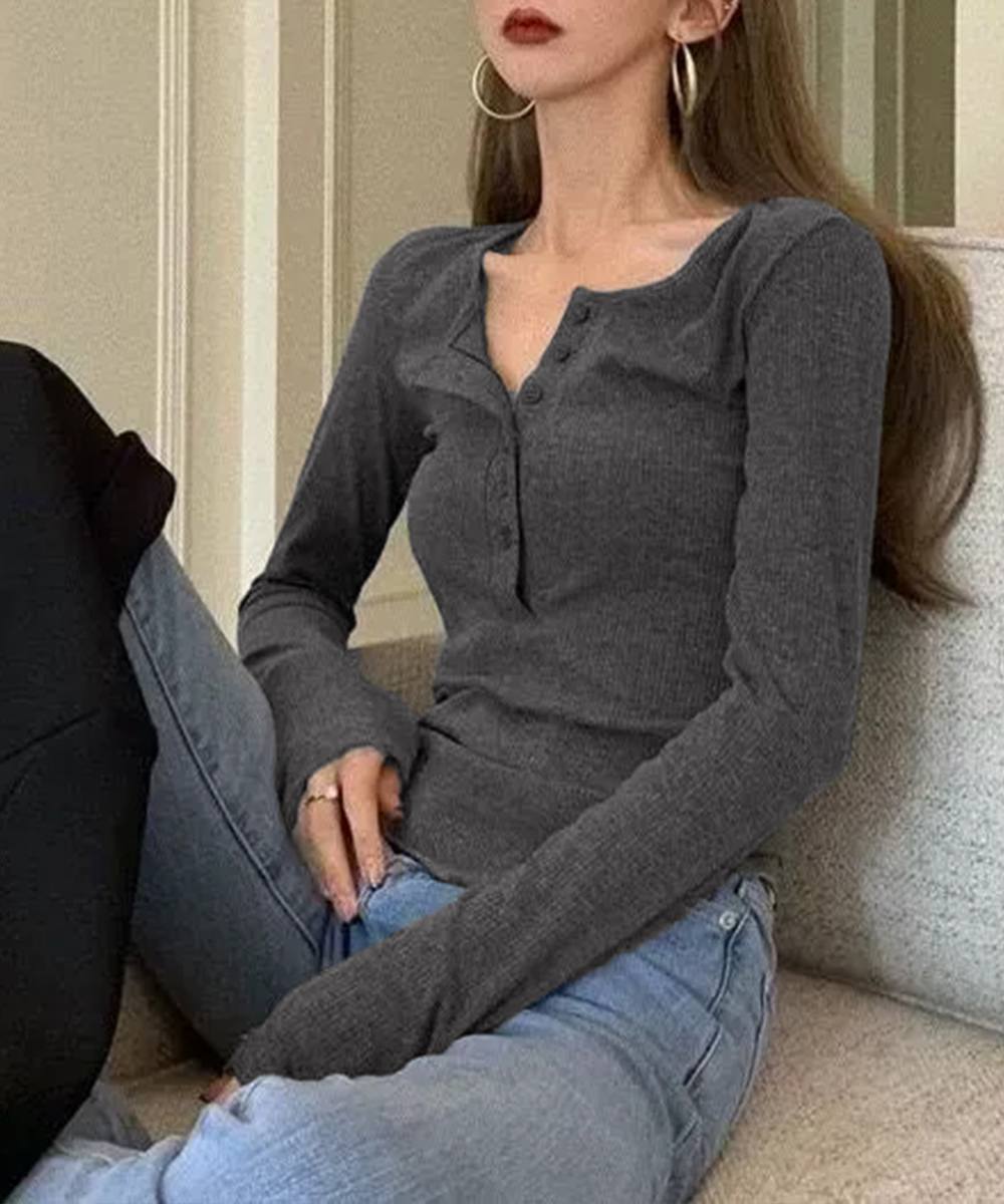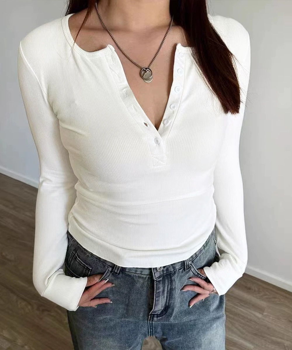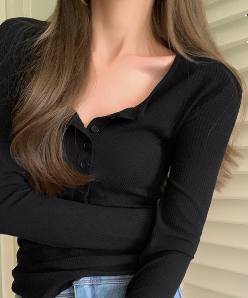 シンプルファッションに最適なリブ編み長袖ヘンリーネックカットソー。
