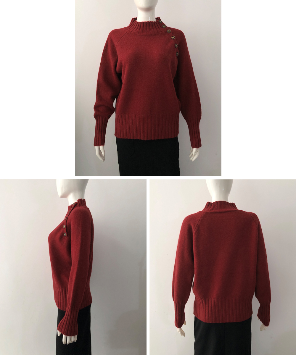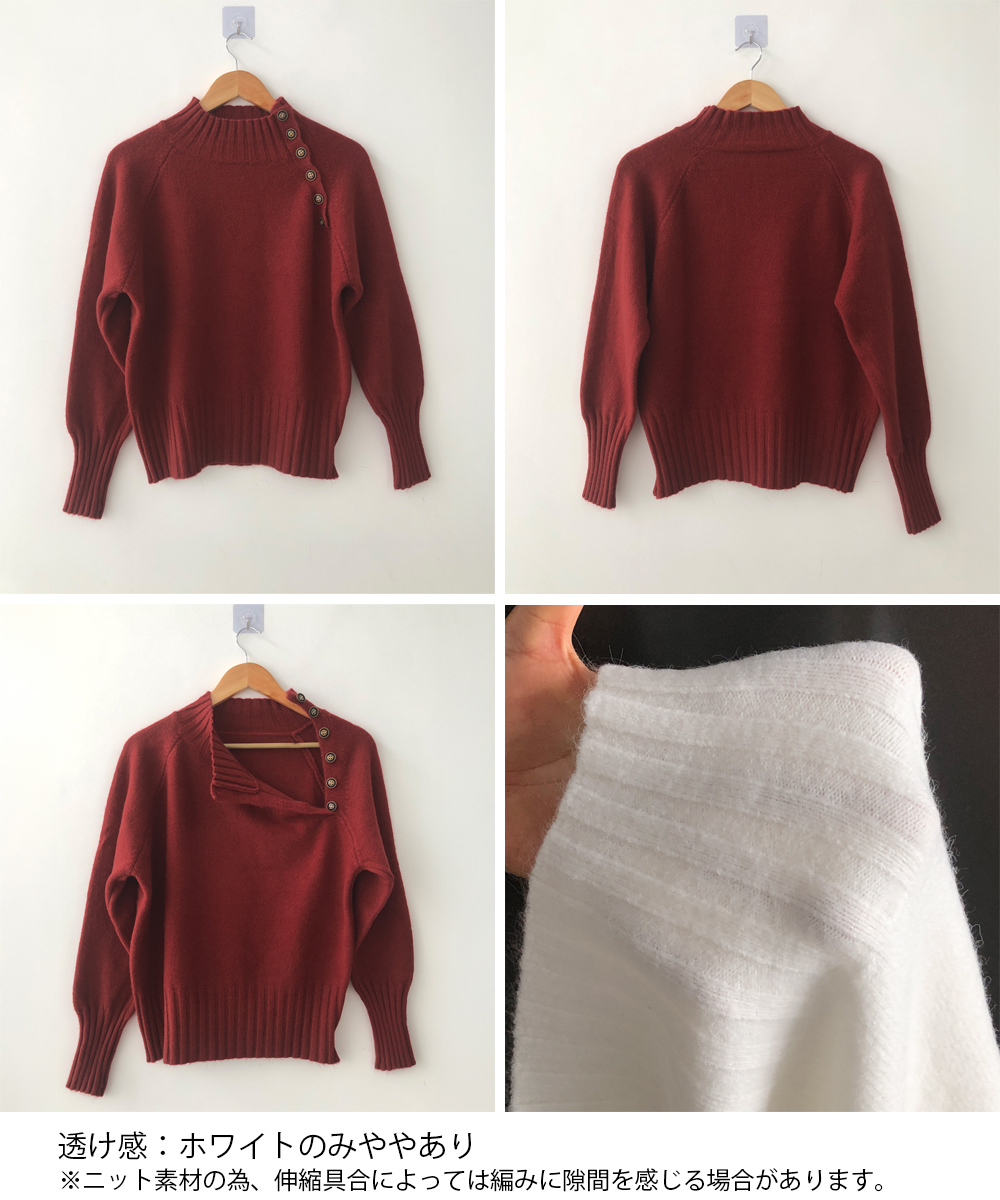 ニットセーター レディース ハイネック ニットウエア 着回しニット きれいめ 着やせ 大人カジュアル おしゃれセーター女 ニットプルオーバー ゆったりニット無地 ゆったりとしたシルエットで華奢見えするハイネックニット。 肩から首元にかけて並んだボタンデザインがアクセントになり、シンプルながらも上品な印象を与える。 1枚でももちろん、ジャケットや羽織のインナーとしても重宝するアイテム。 素材:ポリエステル75%+アクリル25% カラー:ブラック/ホワイト/グレー/ワインレッド サイズ:ワンサイズ 着丈:約58cm ゆき:約76cm 身幅:約45cm 胸囲:約90-150cm 裏地:なし 伸縮性:あり 透け感:ホワイトのみややあり ※ニット素材の為、伸縮具合によっては編みに隙間を感じる場合があります。 生産国:中国 ※すべて平置きサイズです(採寸方法違いより、多少の誤差がございますので、ご了承ください)。 ※海外輸入品のため、商品の細部仕様は多少異なる場合がございます。予めご了承の上、ご注文お願い致します。