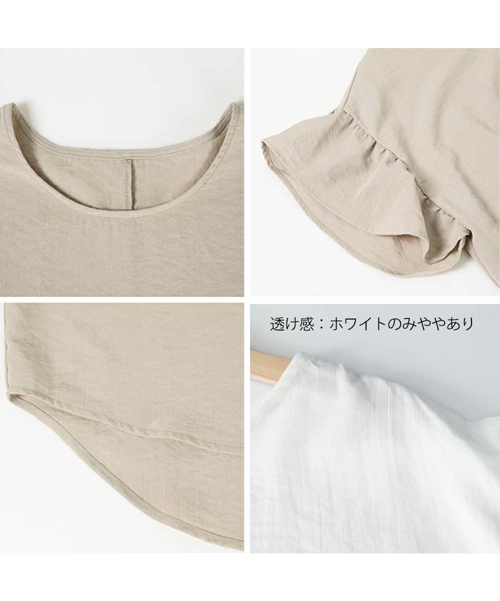 カラー:ブラック/ホワイト/ベージュ/ブルー サイズ:ワンサイズ 着丈:前丈約65/後ろ丈約70cm 肩幅:約57cm 袖丈:約10.5cm ゆき:約39cm 身幅:約59cm 胸囲:約128cm 裏地:なし 伸縮性:なし 透け感:ホワイトのみややあり