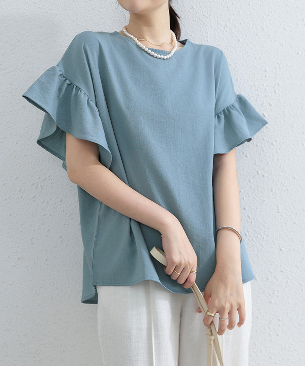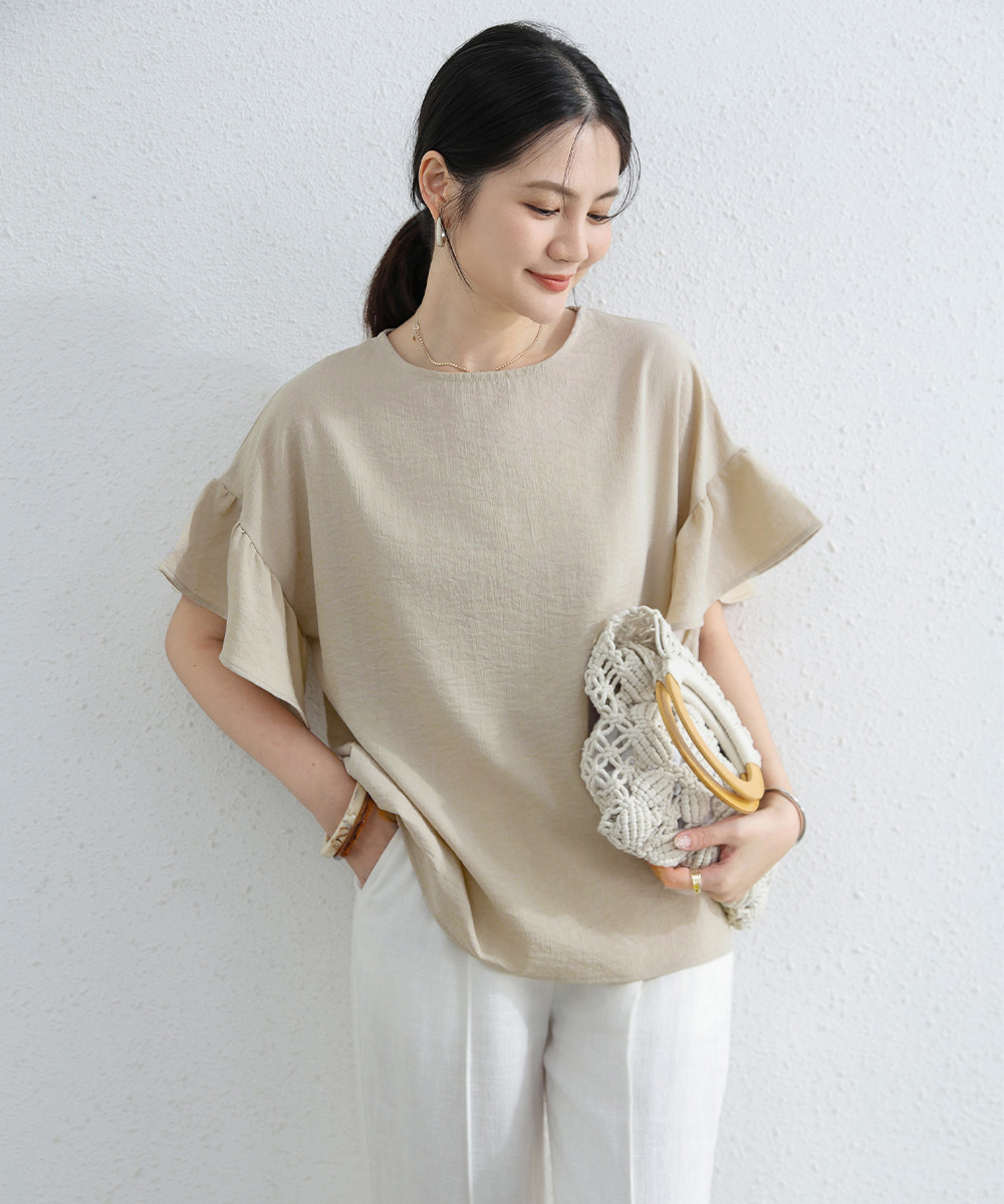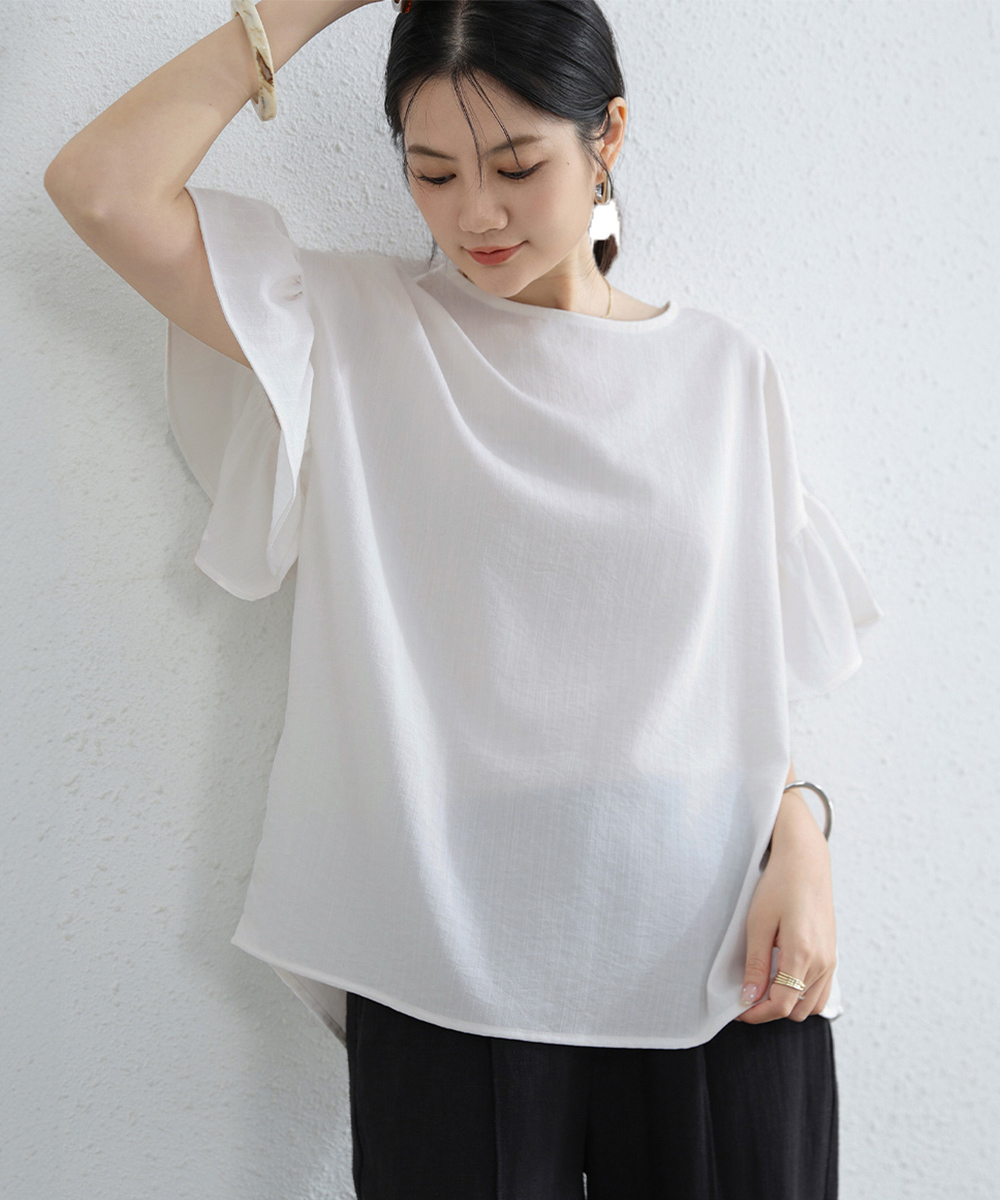 シンプルファッションに映える、フリル袖が上品なブラウス。