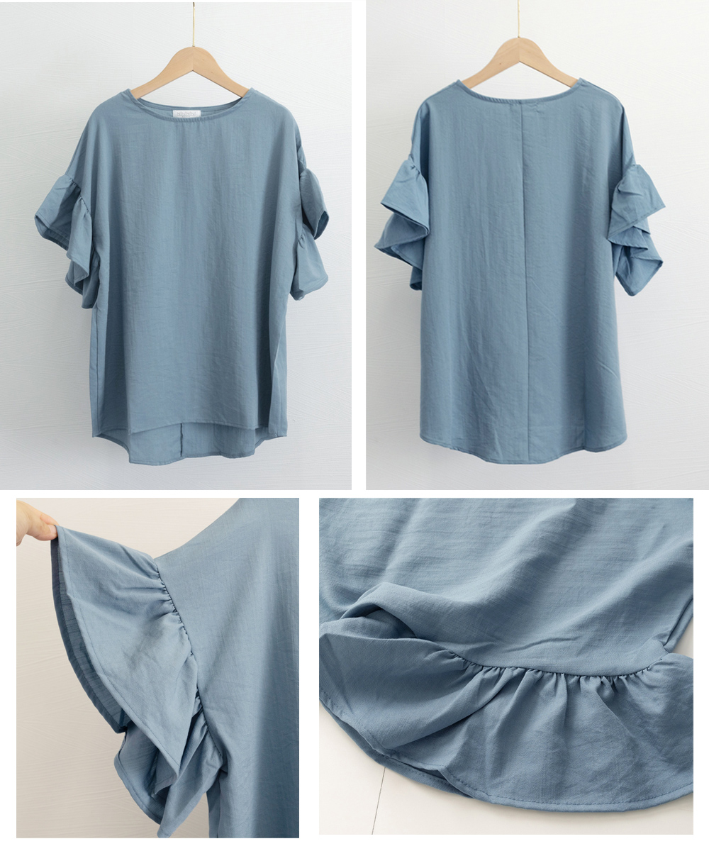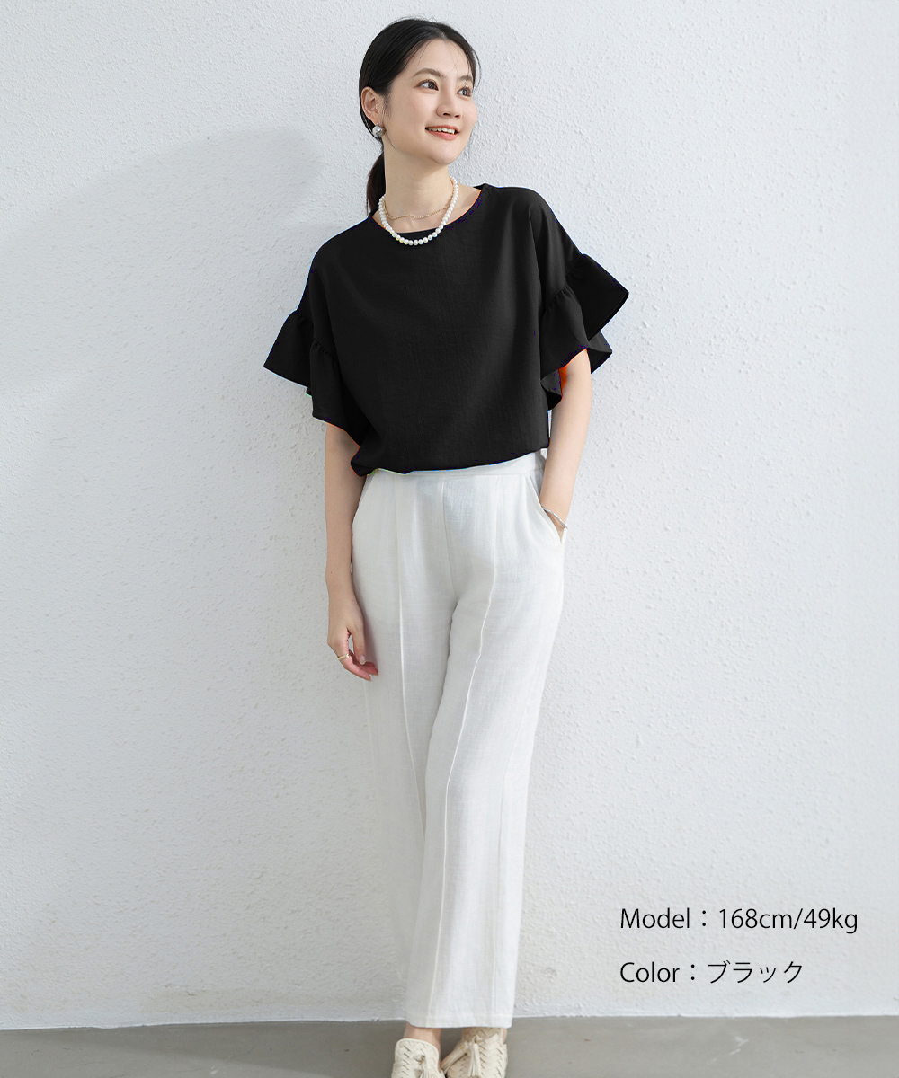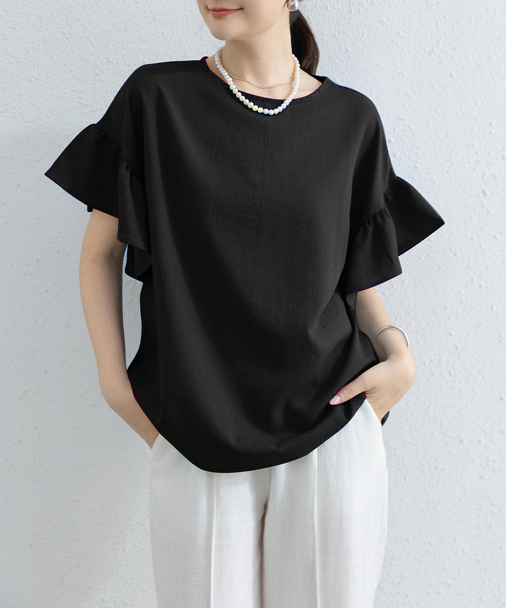 シンプルファッションに映える、フリル袖が上品なブラウス。